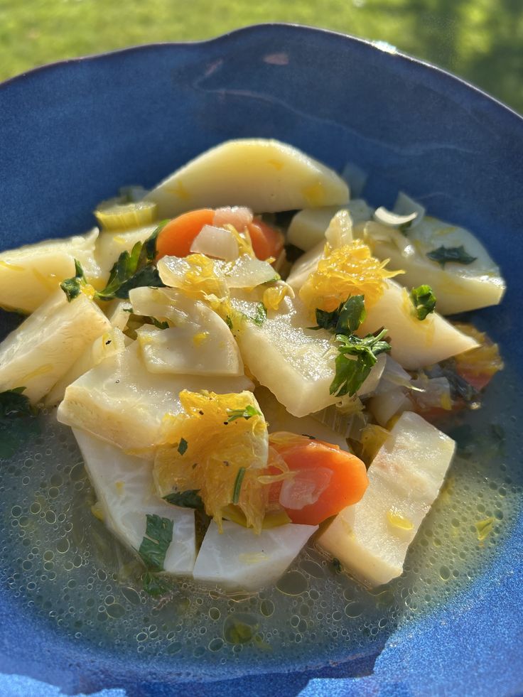 Malzemeler: Kereviz, patates, havuç, soğan, portakal, natürel sızma zeytinyağı